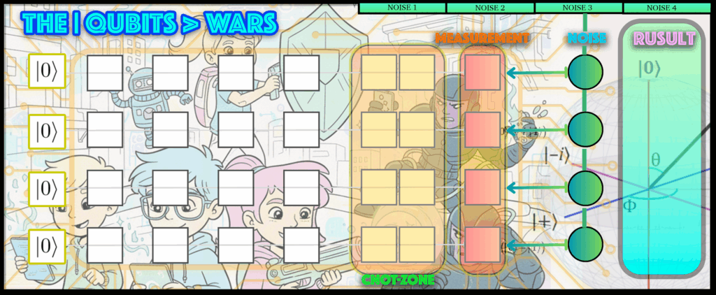 - วางกระดานวงจรควอนตัม บนโต๊ะให้ทุกคนมองเห็นชัดเจน จากนั้นวาง Result Tile ลงในช่อง Result และวาง Noise Tile ไว้ด้านบนกระดาน ที่ตำแหน่งวางการ์ด Noise แต่ละใบ