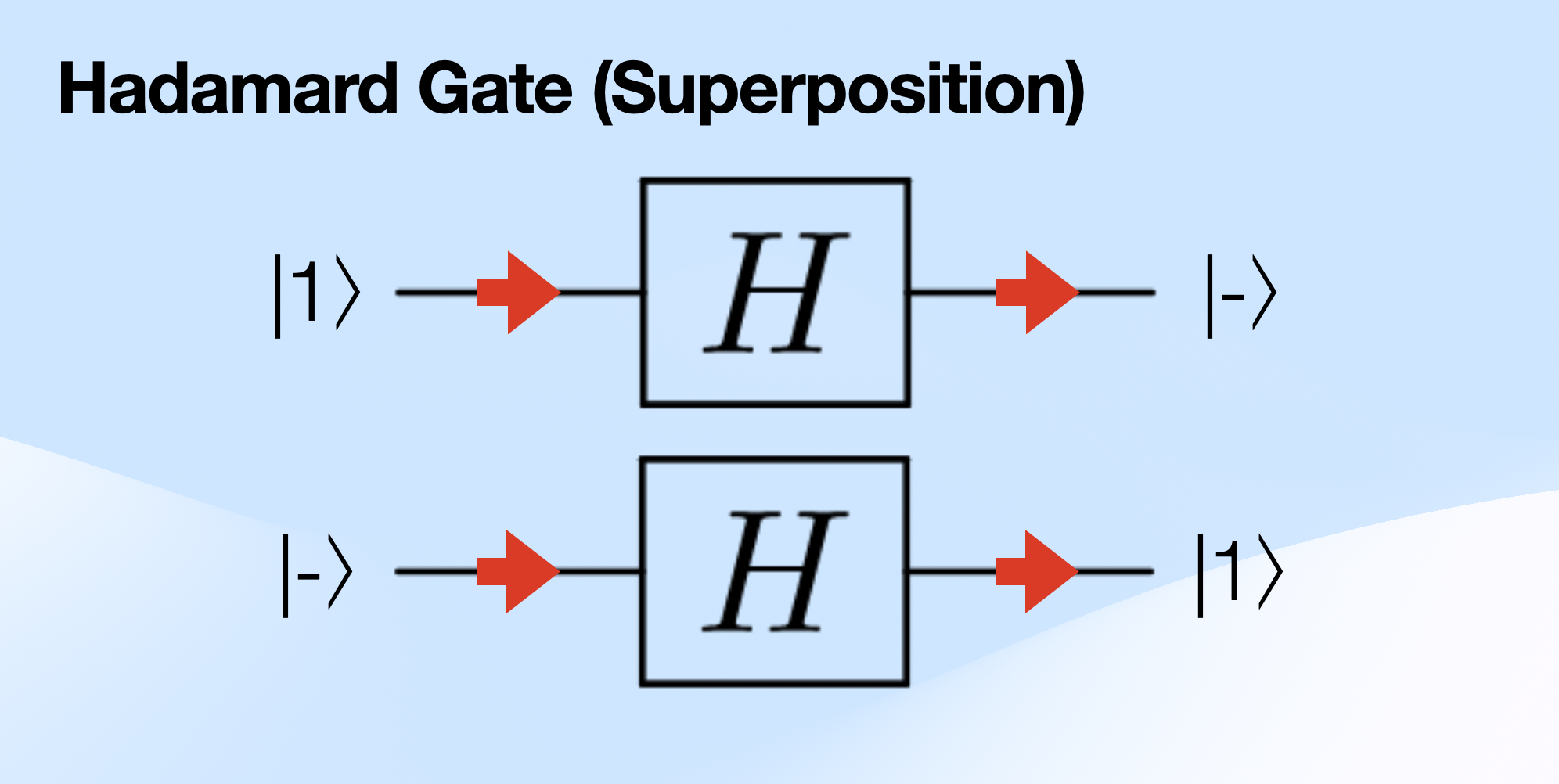 • และ H สามารถเปลี่ยน |+⟩ กลับเป็น |0⟩ หรือ |−⟩ กลับเป็น |1⟩ ได้เช่นกัน