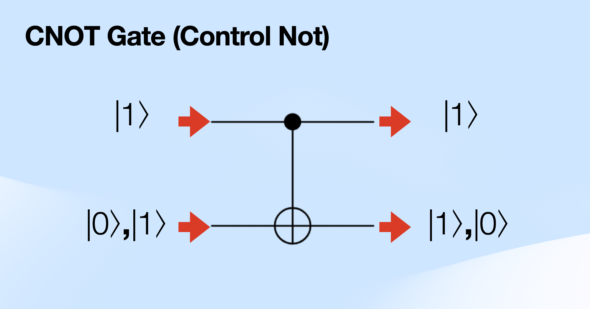 แนวคิดพื้นฐาน: CNOT เป็น Gate สองคิวบิต มีหนึ่งตัวเป็น control และอีกตัวเป็น target ถ้า control อยู่ในสถานะ |1⟩ จะทำ X (Not) กับ target แต่ถ้า control เป็น |0⟩ จะไม่ทำอะไร