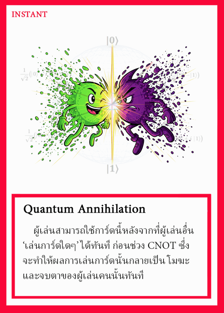 การ์ดใบนี้จำลองแนวคิดของ “Quantum Annihilation” — การชนกันของอนุภาคและแอนติอนุภาคซึ่งทำให้ทั้งสองสลายกลายเป็นพลังงาน ในเชิงตรรกะควอนตัม นี่สื่อถึงการ ยกเลิกสถานะที่ไม่เข้ากัน (interfering states) ซึ่งทำให้เอฟเฟกต์หนึ่งถูกลบล้างโดยอีกเอฟเฟกต์หนึ่งในทันที