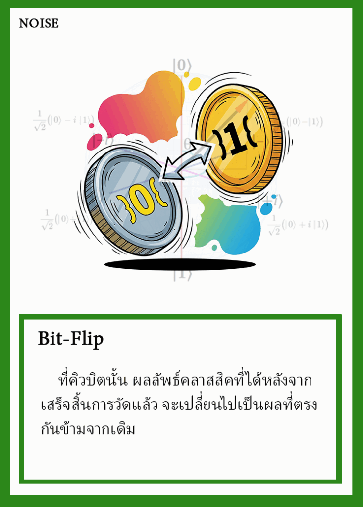 ตัวอย่างผลกระทบ: หากวงจรของคุณควรจะได้ |0⟩ (0 คะแนน) แต่มี Bit-Flip อยู่ คิวบิตจะพลิกเป็น |1⟩ (1 คะแนน) ทันที (หรือกลับกันจาก |1⟩ เป็น |0⟩)