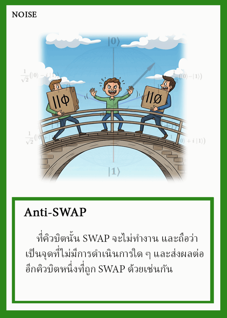 ตัวอย่างผลกระทบ: ผู้เล่น A วาง SWAP โดยมีคิวบิตสองคิวบิตเป็นเป้าหมาย แต่คิวบิตบนมี Noise นี้อยู่ ผลคือ SWAP จะไม่ทำงานเลย สถานะของคิวบิตบนและล่างจะไม่สลับกัน